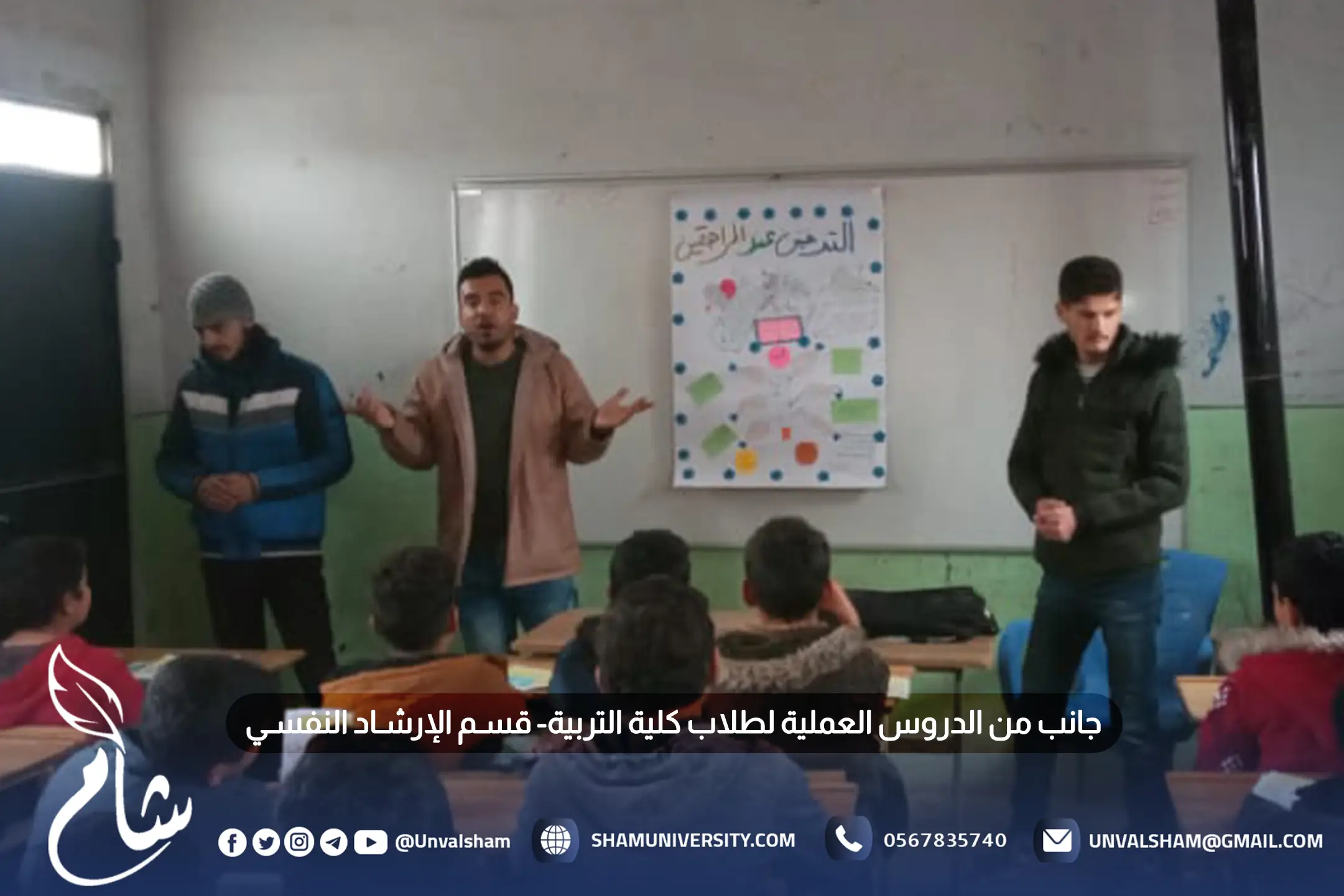 نفذ مجموعة من طلاب كلية التربية قسم الإرشاد النفسي- السنة الثالثة سلسلة من المحاضرات العملية لطلاب الصف الثامن والتاسع في مدرسة الشهداء بعنوان “التدخين عند المراهقين”.