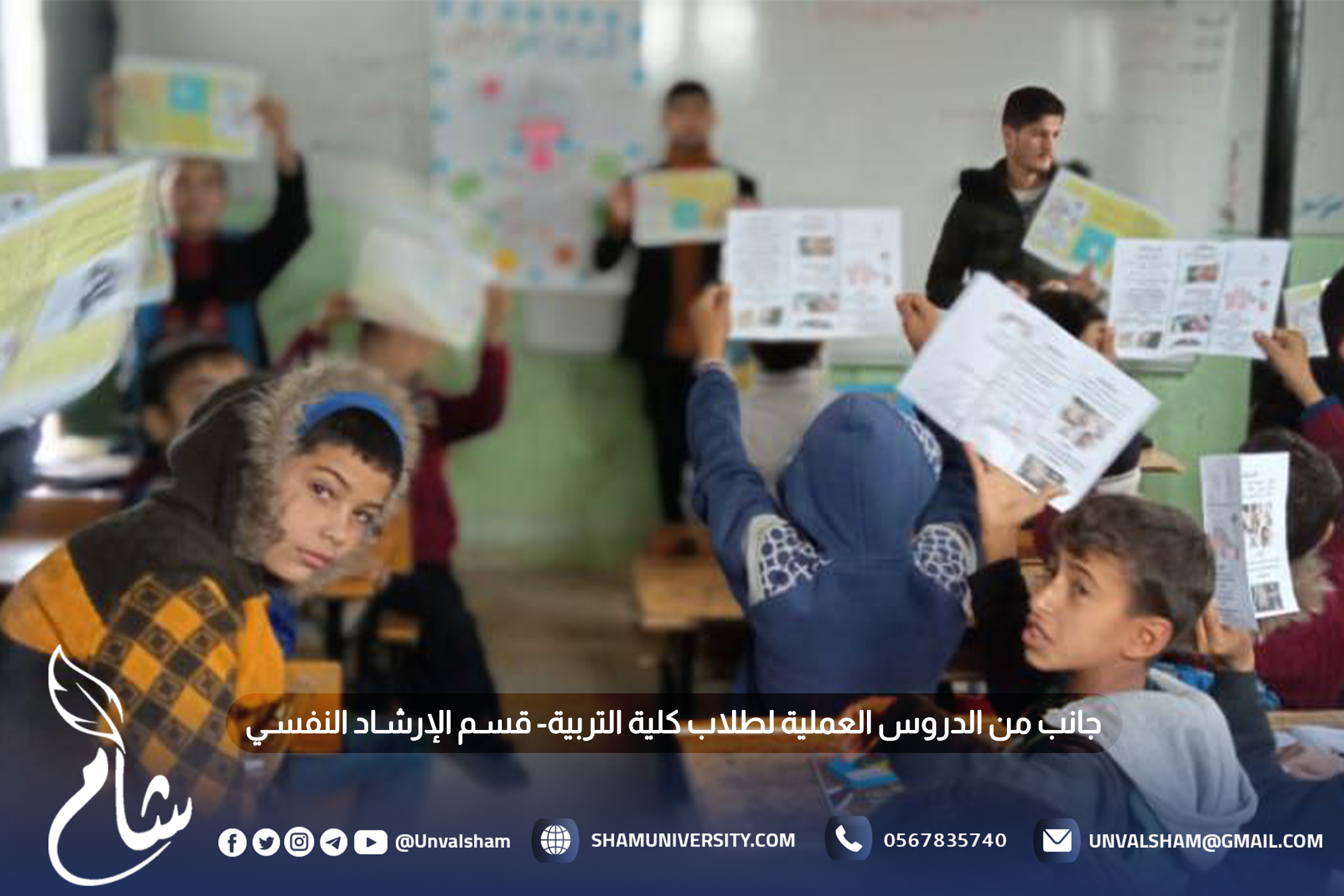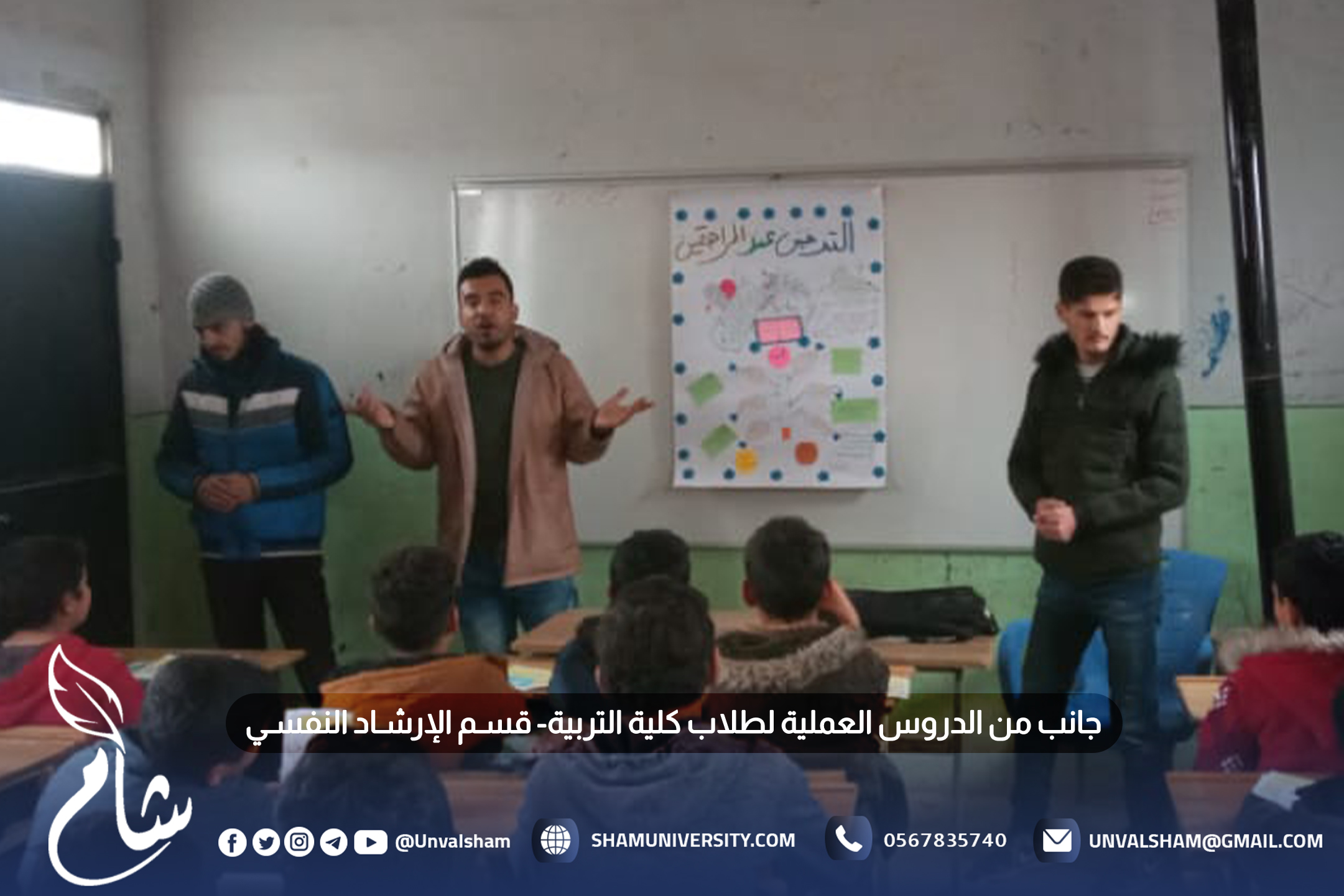 نفذ مجموعة من طلاب كلية التربية قسم الإرشاد النفسي- السنة الثالثة سلسلة من المحاضرات العملية لطلاب الصف الثامن والتاسع في مدرسة الشهداء بعنوان "التدخين عند المراهقين".
