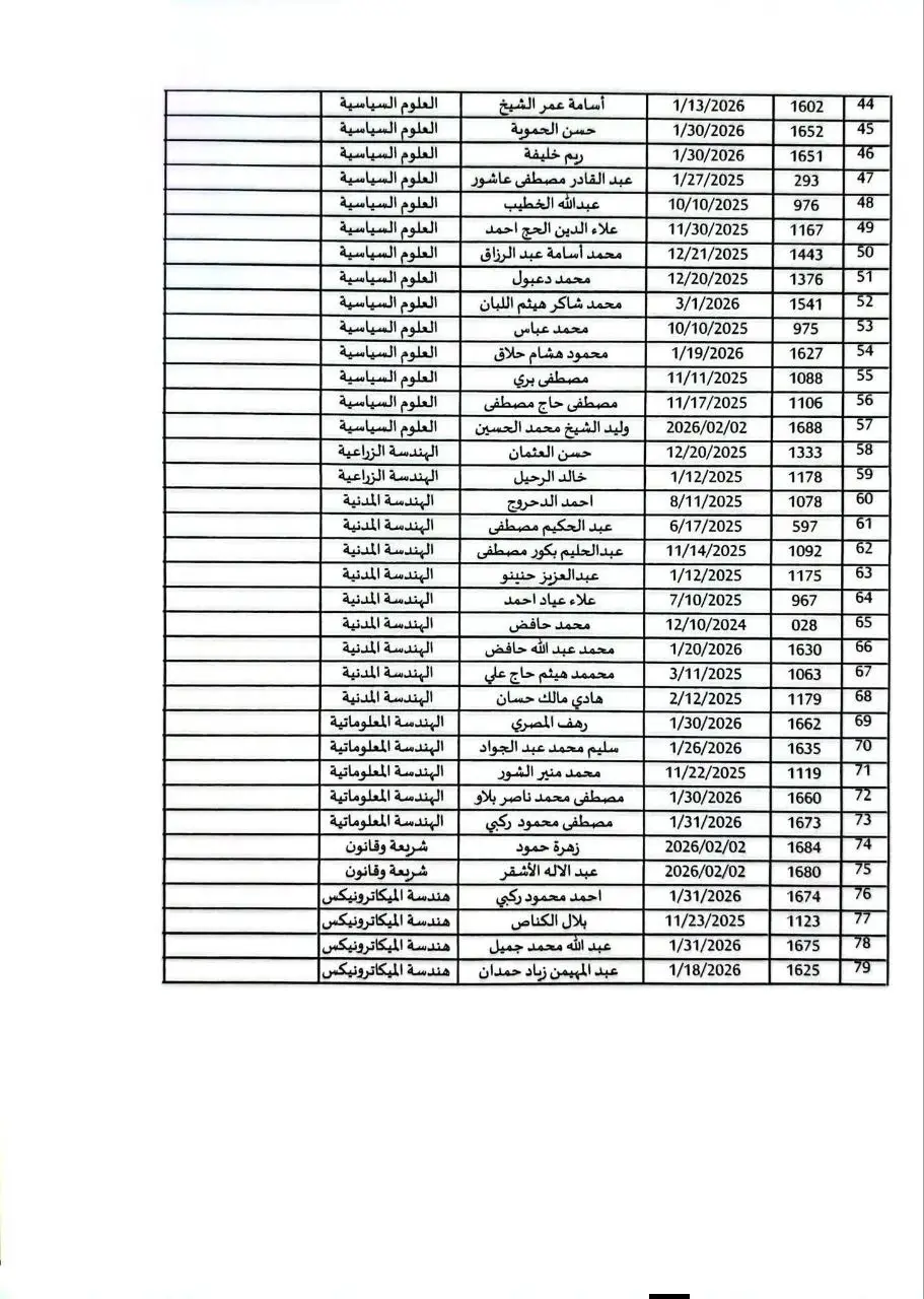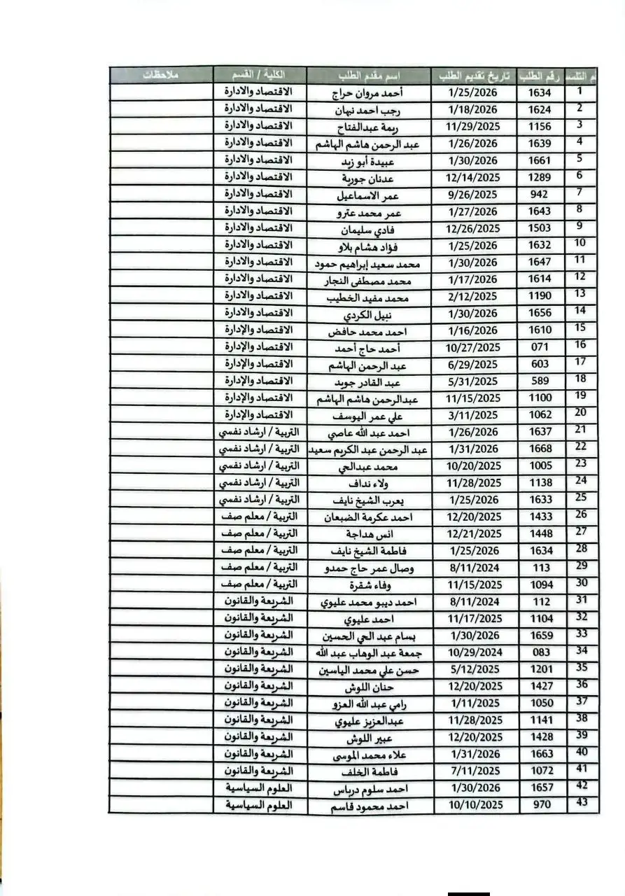 على جميع الطلاب الواردة اسماؤهم في القائمة المرفقة في الأسفل مراجعة شؤون الطلاب في الجامعة خلال اوقات الدوام الرسمي خلال الفترة